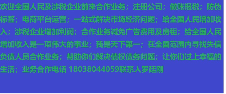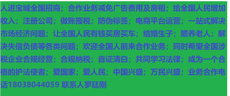 人進(jìn)寶城全國(guó)招商;合作業(yè)務(wù)減免廣告費(fèi)用;歡迎全國(guó)涉稅企業(yè)前來(lái)合作;業(yè)務(wù)合作電話 18038044059 聯(lián)系人羅廷剛
