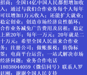 人進(jìn)寶城全國(guó)招商;合作業(yè)務(wù)減免廣告費(fèi)用;歡迎全國(guó)涉稅企業(yè)前來(lái)合作;業(yè)務(wù)合作電話 18038044059 聯(lián)系人羅廷剛